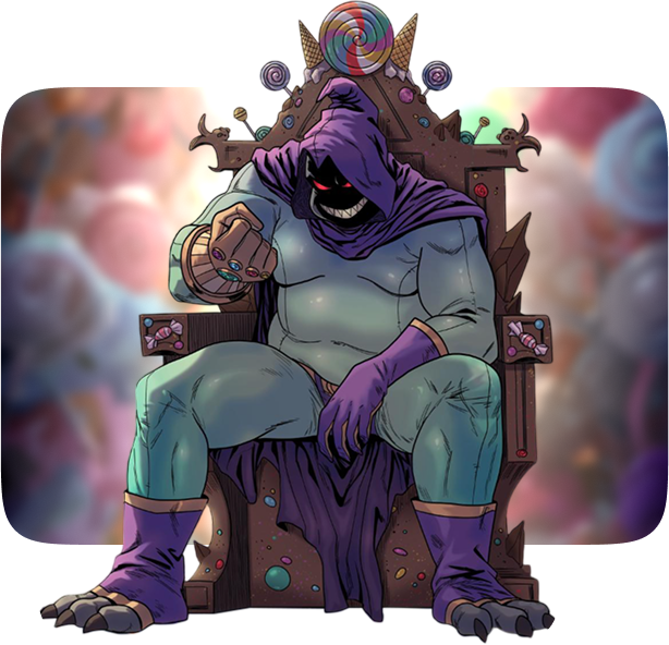 He sits on the Candy Throne in a spooky candy land filled with giant lollipops and chocolate rivers. His castle smells yummy... but don’t be fooled—it’s super dangerous!