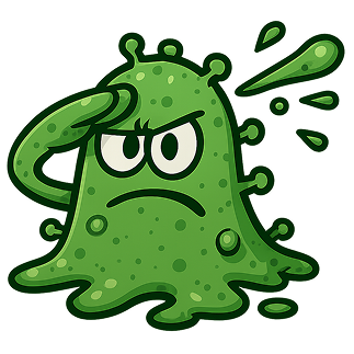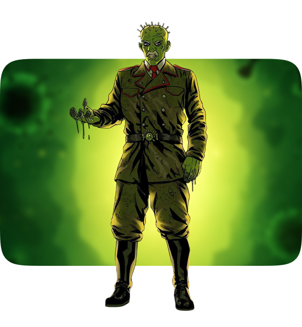 Once a forgotten bacteria in a dirty lunchbox, General Germ mutated after a lightning bolt struck a moldy sandwich! Now, he’s big, bad, and full of germs. Dressed in his grimy general’s suit, he’s ready to lead the charge against cleanliness and health!